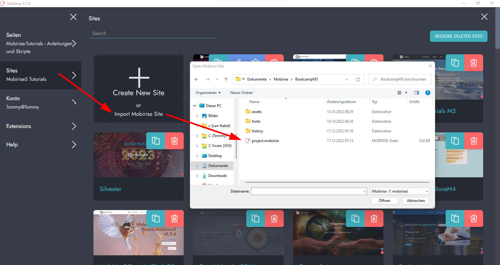 Meinst Du tatsächlich das gesamte Verzeichnis am PC für die lokale Publizierung oder hast Du lediglich die "Kachel" des Projektes in Mobirise unter "Sites" versehentlich gelöscht.