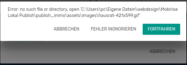 Wenn man Bilder selbst über ein <img> Tag einbaut, sollte man eine absolute URL zum Bild eintragen, also den gesamten Pfad mit Domain, ansonsten sucht Mobirise das Bild in seiner Projekt-Datei, wird es nicht finden und es gibt eine Fehlermeldung. Mobirise "kennt" nur die Bilder, die über den Mobirise-Bild-Editor eingefügt wurden.