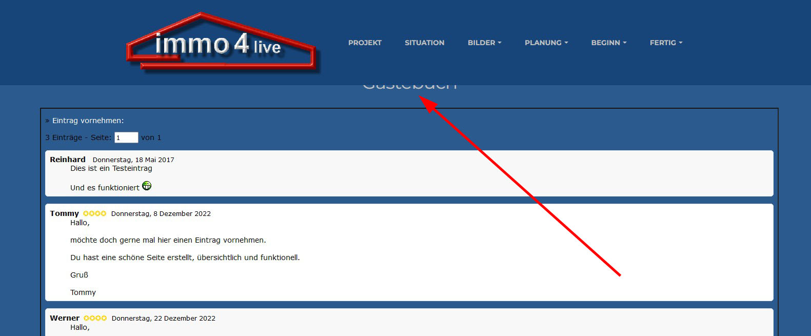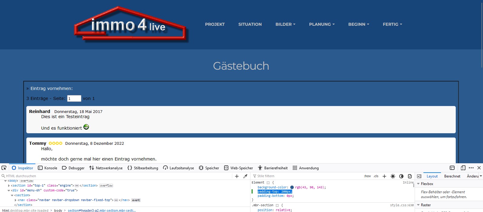Ich baue ja gerade meine unter Mobirise 3 erstellte Seite mit Mobirise 4 neu. Das noch in Mobirise 3 erstellte Gästebuch (online noch verfügbar http://www.immo4live.de/gastbuch.html) habe ich jetzt in Mobirise 4 integriert.