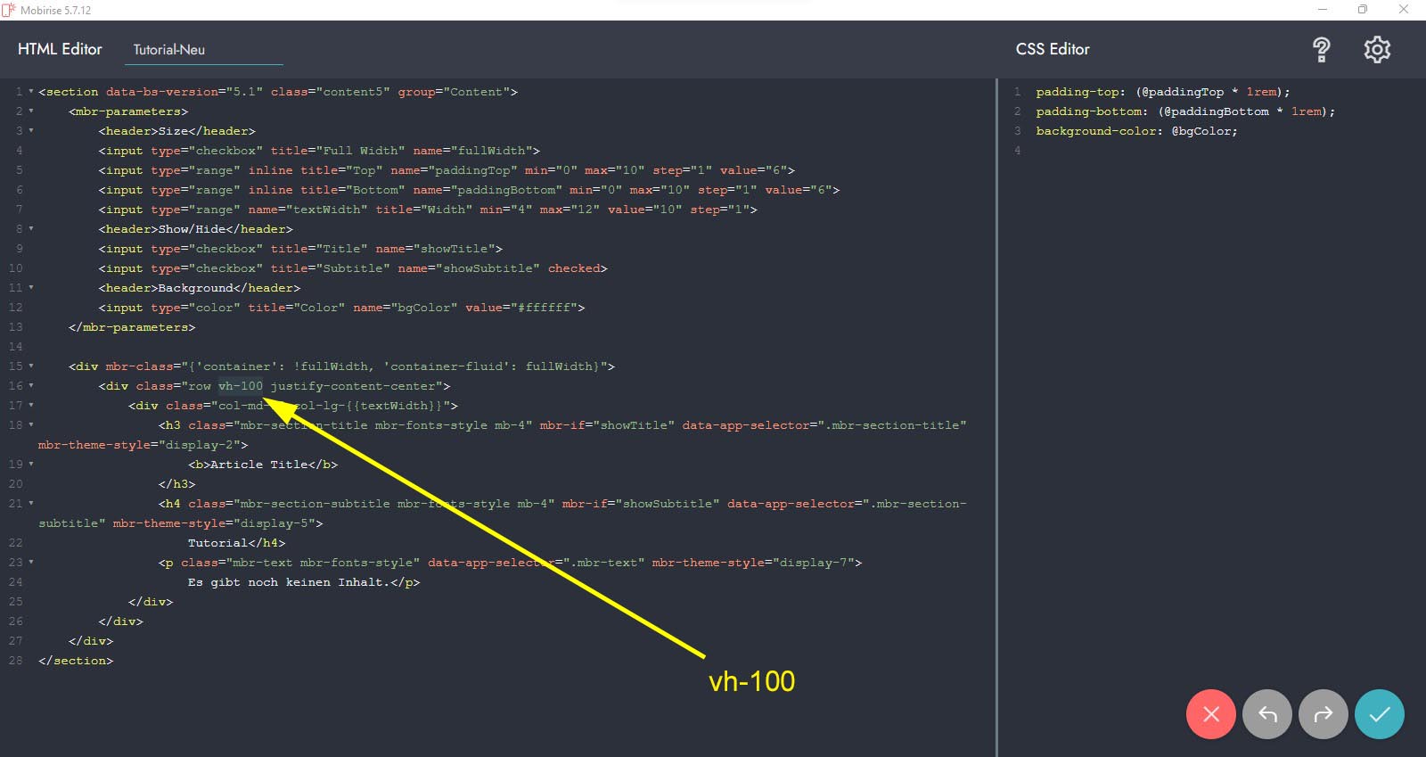 Will ich die Höhe von diesem Block auf 100% meiner Display-Höhe setzen, dann tue ich das mit vh-100 (vertikale Höhe = 100%) oder auch irgendeine andere Höhe (siehe weiter unten mein Beispiel mit der CSS Class).