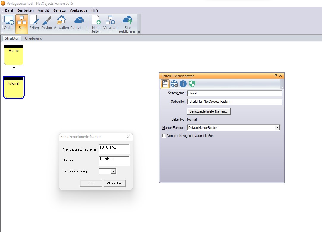 > "Seitenname" > also dann heißt der "Dateiname" auch so. Im Screenshot zu sehen als "tutorial" im Eigenschaften-Fenster (F3 Taste zum Öffnen des Eigenschaften-Fensters).