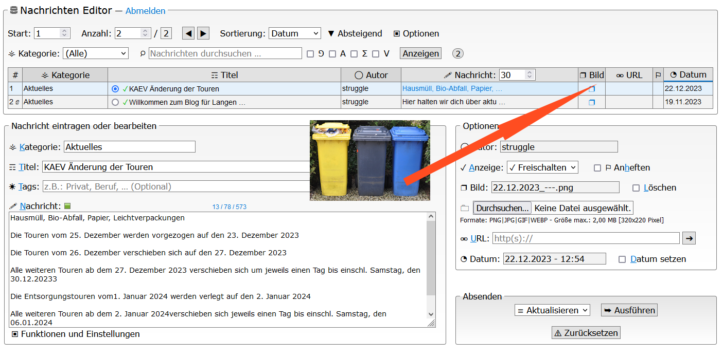 Wenn da so ein falsches Datum angezeigt wird, dann lösche es doch (Checkbox: Löschen) und dann auf "Ausführen" klicken. Im zweiten Schritt wählst du die Nachricht aus und lädst das Bild erneut hoch.