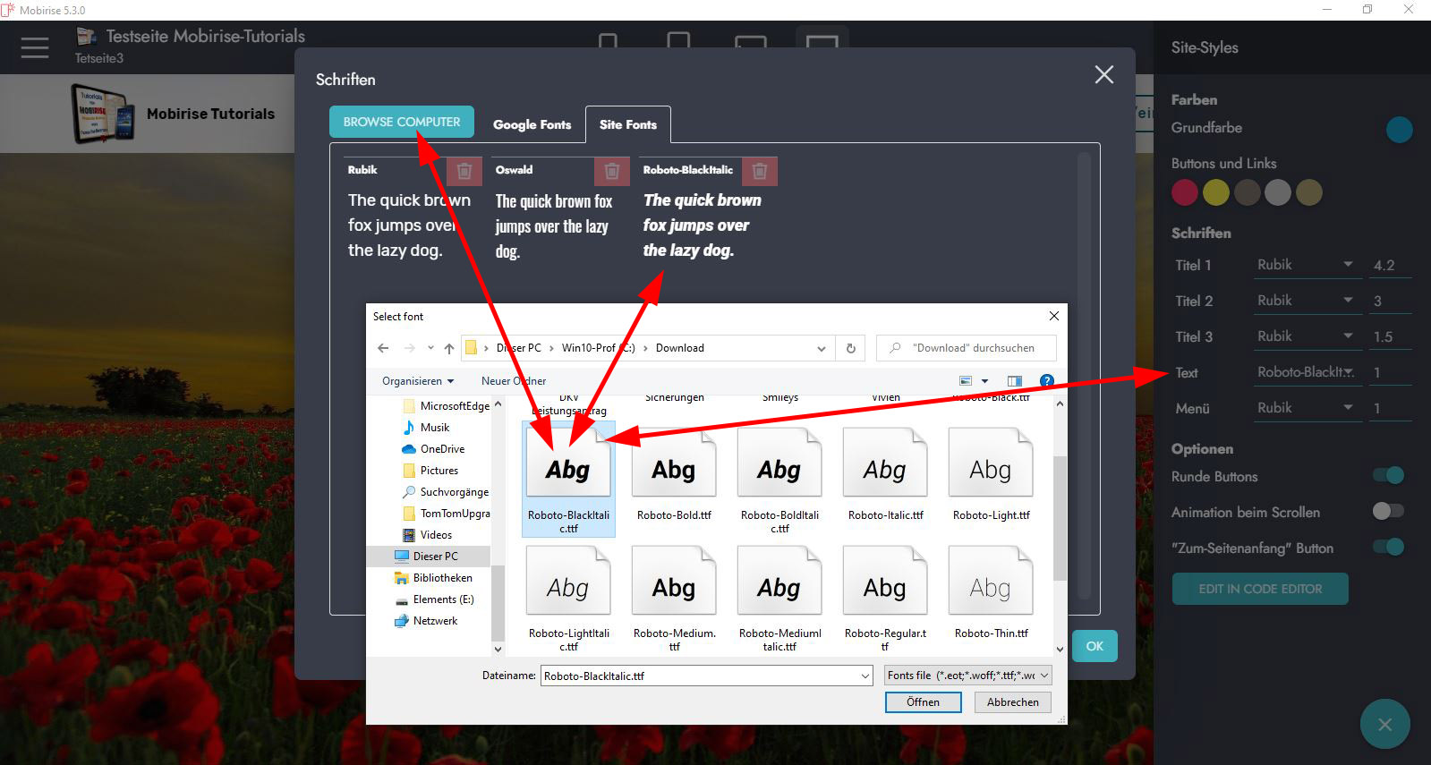 Hallo TommyTommy Herrmann hat geschrieben: Mo 1. Mär 2021, 05:20 Klicke dann im Fenster "Schriften" auf die Karteikarte "Browse Computer" und wähle die herunter geladene Schrift. Diese Schrift wird dann den Schriften Deiner Site-Schriften hinzugefügt und mit auf den Server geladen: