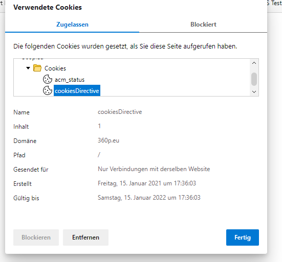 Siehe Testseite hier : https://360p.eu/cookie/