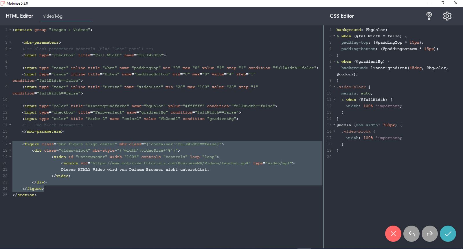 Du kannst auch ganz simple einen ganz normalen Video-Block von Mobirise verwenden und schlichtweg den Iframe mit dem HTML5-Tag ersetzten (Dauer 2 Sekunden).