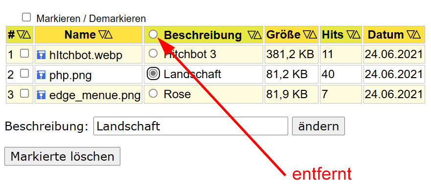 <label title="Keine Beschreibung ändern"><input type="radio" name="option" value="off" checked="checked" onClick="descriptionEdit(``)"></label>Nun ist der Radio-Button bei mir dort in der Überschrift auch weg, der ja auch dort nichts bewirkt: