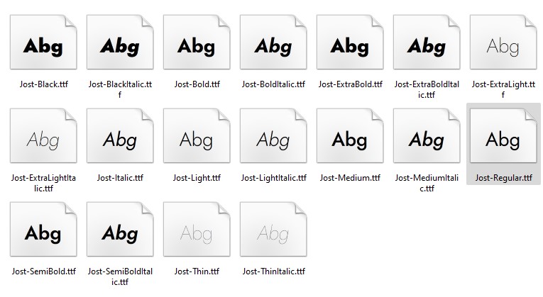 Woher soll ich zum Beispiel überhaupt bei den statischen Typen der Schrift "Jost" erkennen, welches Font-Weight nun zum Beispiel "Jost-Regular" genau hat? Im Screenshot unten sind sämtliche statischen Font-Weights der Schrift "Jost" zu sehen. Dafür gibt es aber nur einen Namen und ich kann kein Gewicht von 400 oder 700 ausmachen.