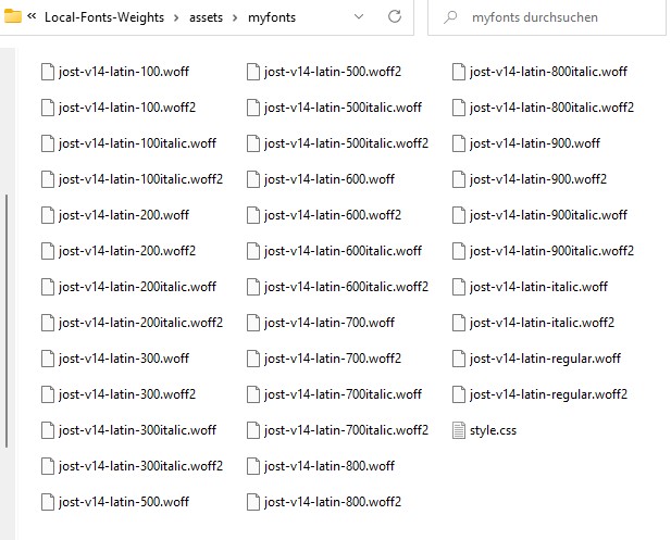 Nach meinem Verständnis stehen ja alle 18 Font-Weights (.woff und .woff2) in der lokalen CSS-Datei "style.css" und verweisen auf alle Font-Weights, die ich auch auf den Server, in mein Verzeichnis "assets/myfonts/", kopiert habe: