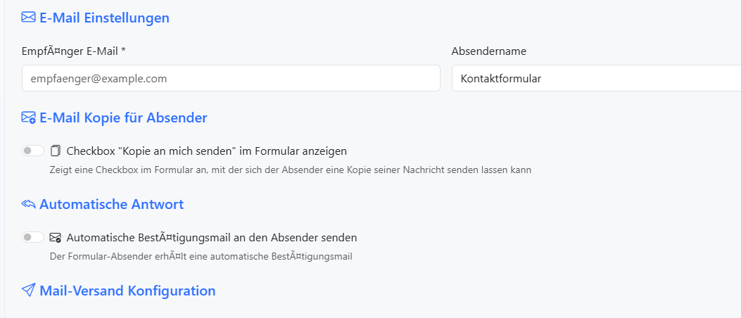 - Automatische Kopie-Checkbox: Bei jedem generierten Formular wird eine Checkbox hinzugefügt, die es dem Absender ermöglicht, eine Kopie seiner Nachricht zu erhalten