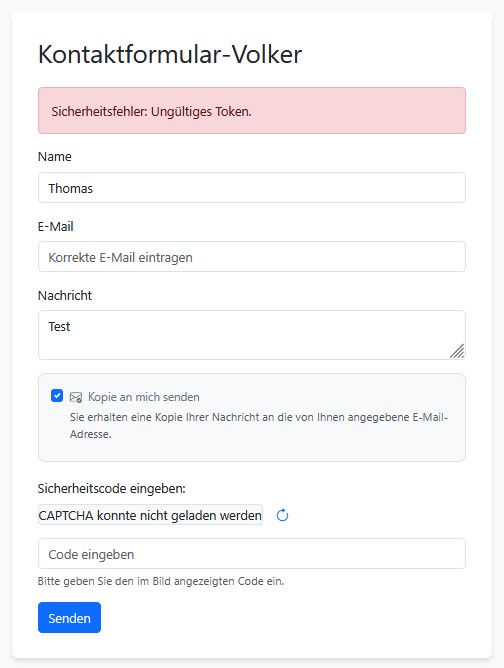 Schon der bloße Klick auf den Senden-Button löst die Fehlermeldung "Ungültiges Token" aus – unabhängig davon, ob ich Felder im Formular ausfülle oder nicht.