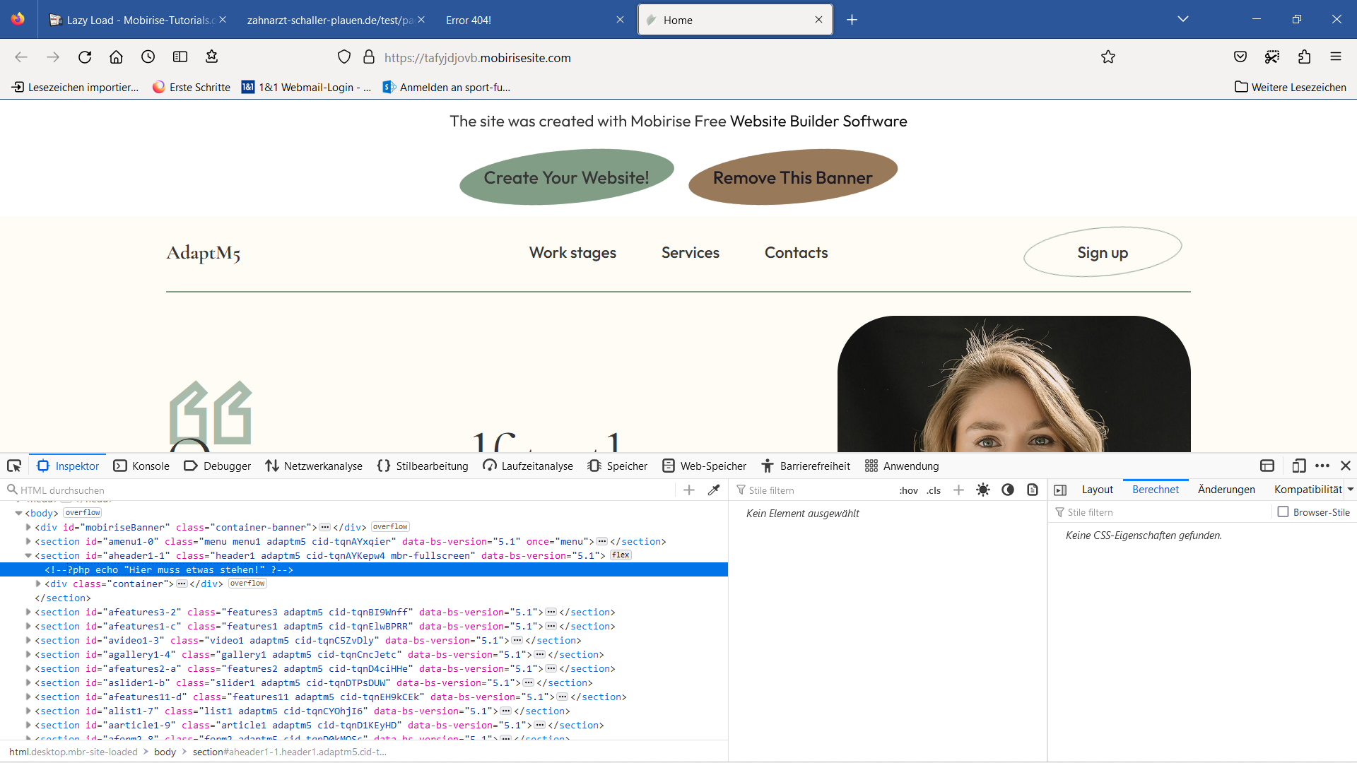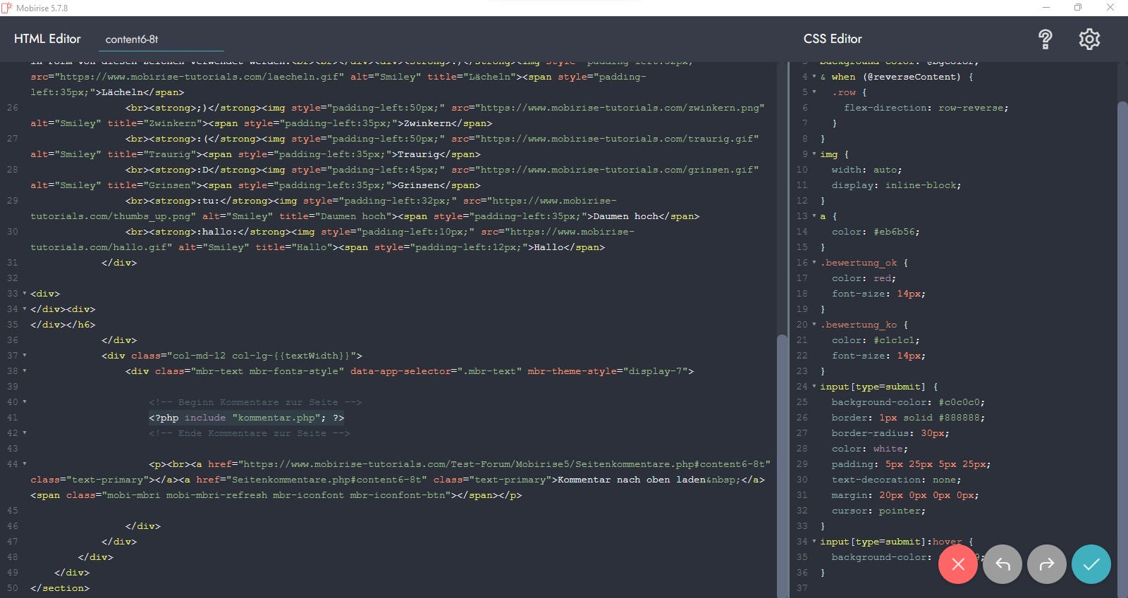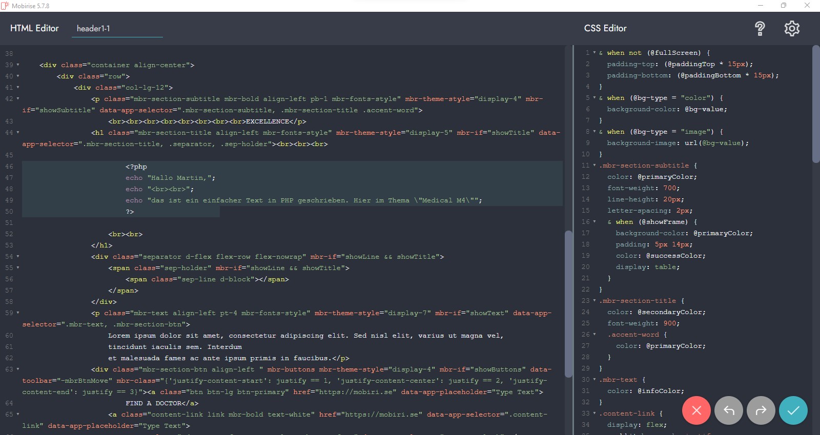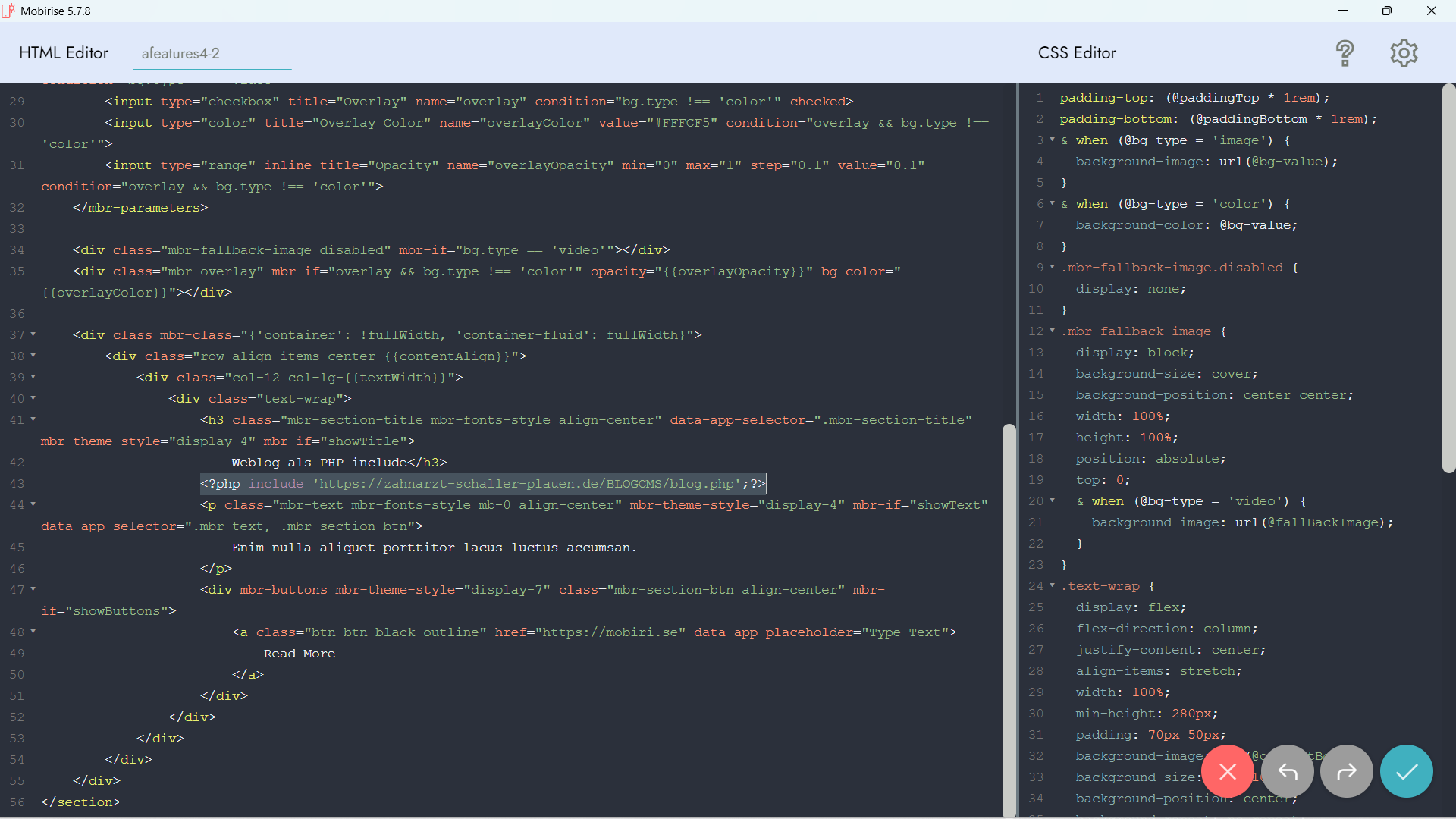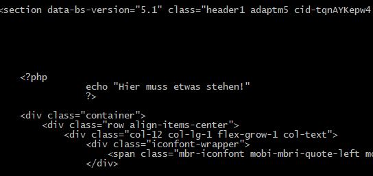 Also - z.B. ein PHP-Include, das ja nur irgendwo in den Body geschrieben wird, also bei Mobirise in den "Code Editor" eines Blocks, wie hier in meinem Screenshot bereits zu erkennen ist: