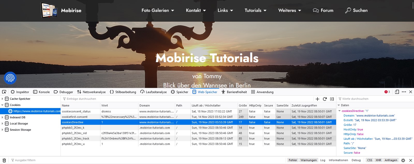 Es wird also mit dem "Cookie Alert" von Mobirise überhaupt gar nichts vom Besucher gespeichert, nur der Browser des Besuchers selbst speichert eben einen notwendigen Cookie (das ist auch erlaubt) für eine erleichterte Bedienung des Benutzers. Daher kann dort auch kein Widerruf verlangt werden - auf was denn?