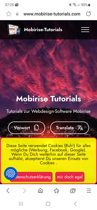 Eigentlich müsstest Du das gesamte Projekt mal auf "Mobirise 5" umstellen (neu machen), denn so scheint das etwas veraltet zu sein, da hättest Du auch den neuen "Cookie Alert" wie Du diesen brauchst und alles. Das kostet dann aber ca. 100,00 EUR im Jahr.