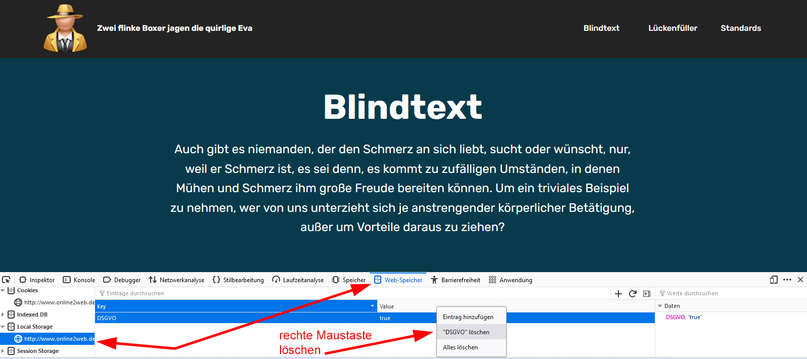 Zum einzelnen Löschen am Desktop von einen "Cookie" - oder wie hier in diesem Fall einem "Local Storage" - hier als Beispiel am Firefox-Browser.