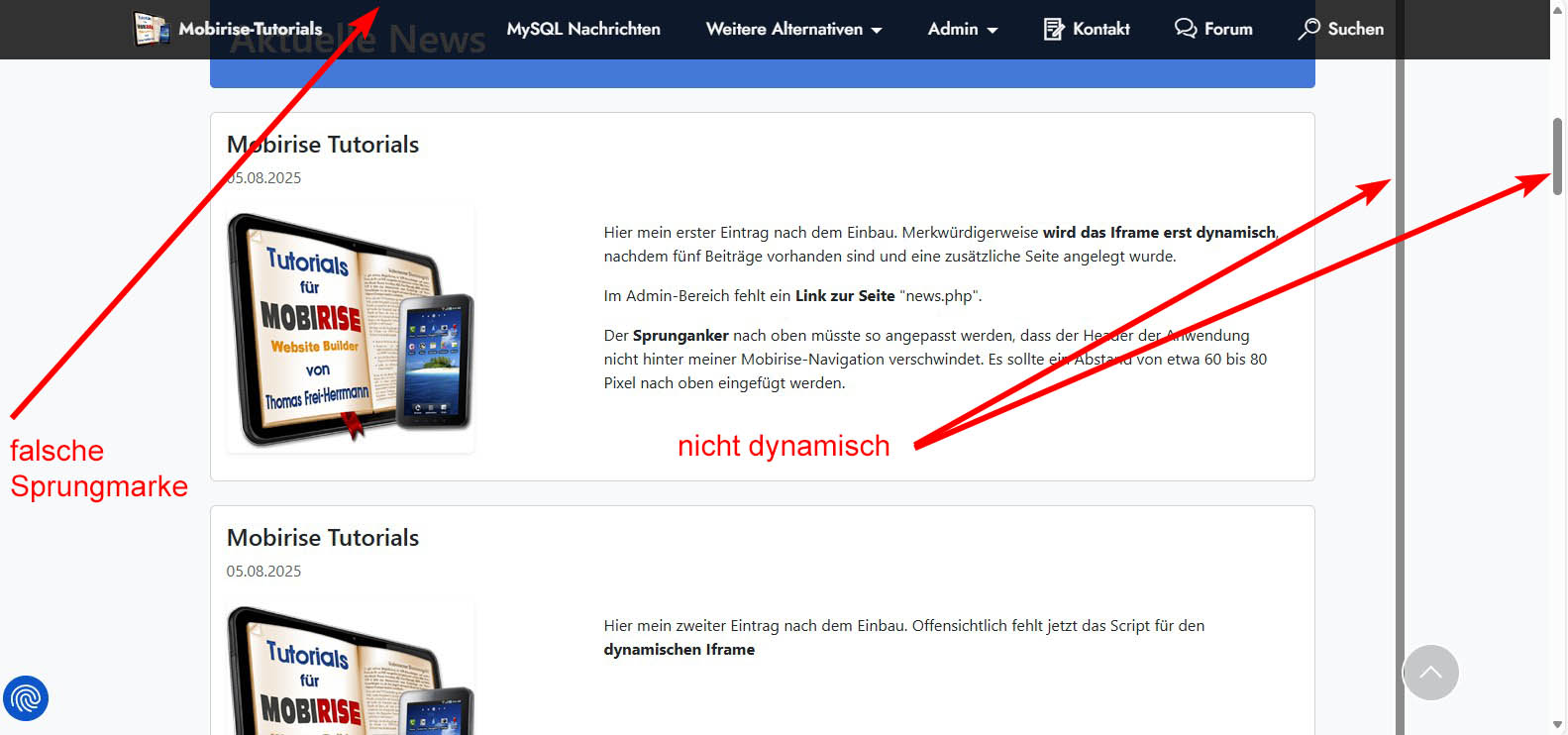 > Der Sprunganker (Seitenwechsel) nach oben müsste so angepasst werden, dass der Header der Anwendung nicht hinter meiner fixierten Mobirise-Navigation verschwindet. Fast alle Menüleisten von Mobirise-Seiten sind fixiert. Es sollte ein Abstand von etwa 60 bis 80 Pixel nach oben eingefügt werden. Das müsste ausprobiert werden oder am besten im Adminbereich einstellbar sein. Es sieht aber sowieso ganz schrecklich aus, wenn der Header der Anwendung direkt am oberen Bildschirmrand "klebt", wie auch zum Beispiel bei Deiner Testseite von den News mit keiner fixierten Navi.