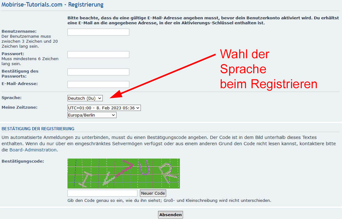 Die Wahl der Sprache - und auch die Zeitzone - konntest Du bereits beim Registrieren treffen: