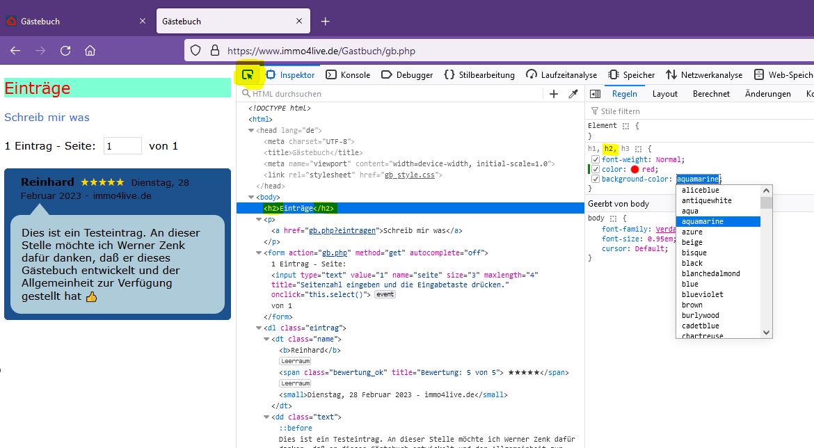 Dazu öffnest Du die CSS-Datei "style.css" vom Gästebuch und schreibst dort am Selektor "body" noch Deine Hintergrundfarbe dazu als: