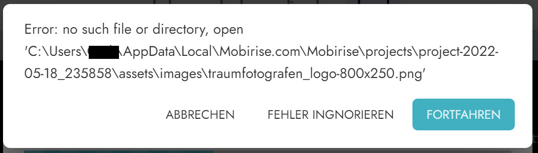 für mich sieht diese Meldung so aus, als wäre an Deiner Projekt-Datei "project.mobirise" etwas nicht in Ordnung. Ist Mobirise vielleicht mal abgestürzt oder durch den Absturz des Computers unsanft geschlossen worden? Wenn da einmal falsche Pfadangaben drinnen stehen, dann bleiben die für immer. Da hilft meist nur auf ein automatisches Backup aus der History zurückzugreifen.