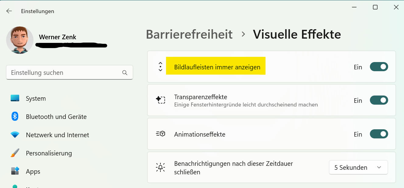 ... ja genau - das ist bei mir ebenso - auch am Windows 11 verschwindet die dünne Bildlaufleiste nach wenigen Sekunden und diese ist aber beim Bewegen der Maus auch sofort wieder sichtbar.