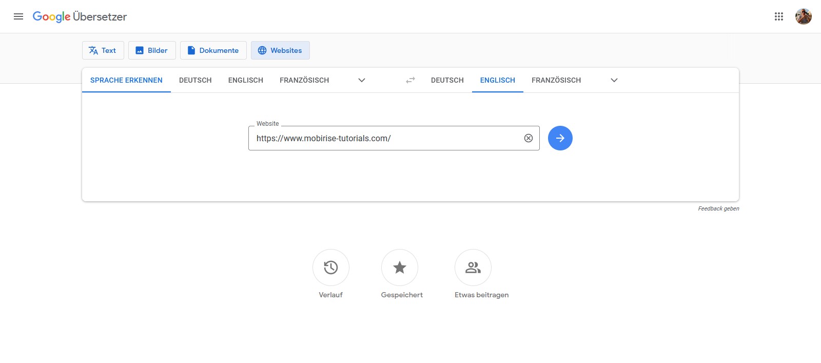 Incidentally, you can also enter an URL directly in "Google Translate" > button "Websites", so that the entire page is then automatically translated: