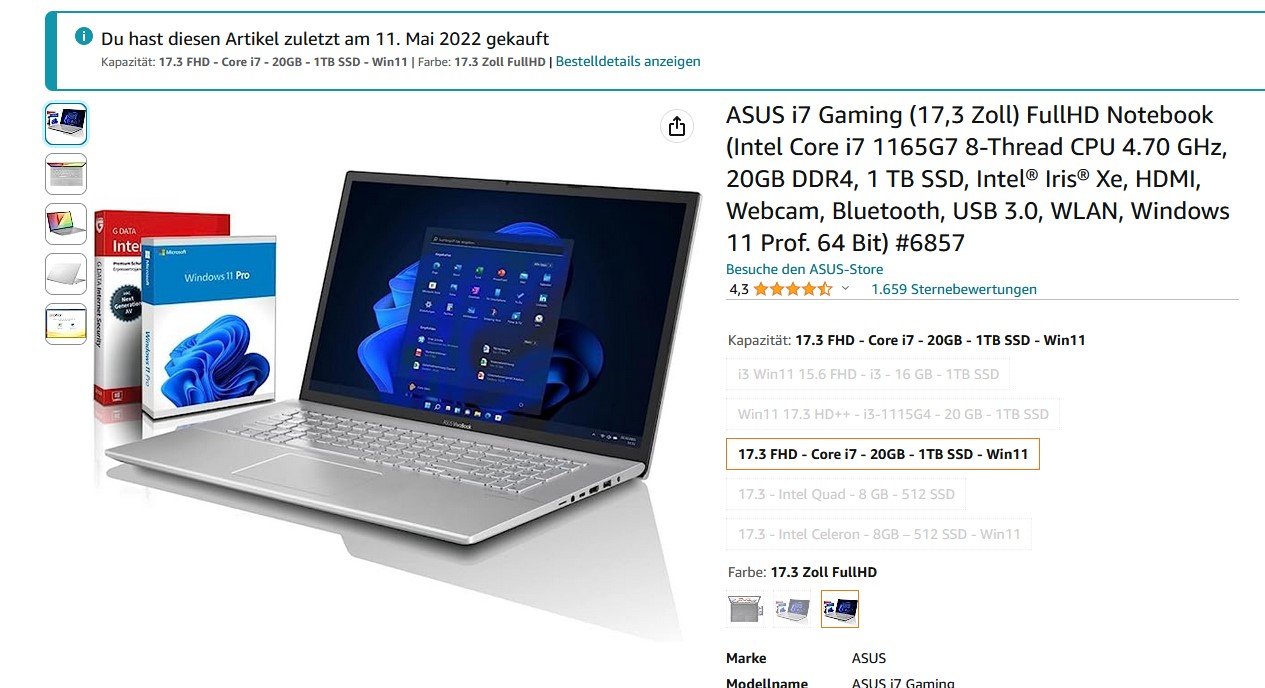 ... der war jetzt recht preiswert mit EUR 888,00 - denn außer für mein Hobby brauche ich keinen Computer mehr. Das geht sicherlich etwas besser. Dieser ASUS hat aber immerhin 20GB RAM, 1 TB SSD.
