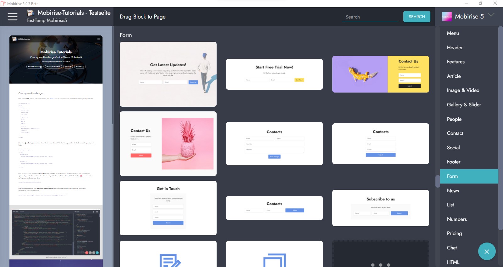 gucke doch einfach mal in der Block-Übersicht von Mobirise. Dort findest Du doch jede Menge bereits vorgefertigte Blöcke mit Formulare bei jedem Mobirise Thema, wie auch beim Standard-Thema "Mobirise5" von meinem Screenshot: