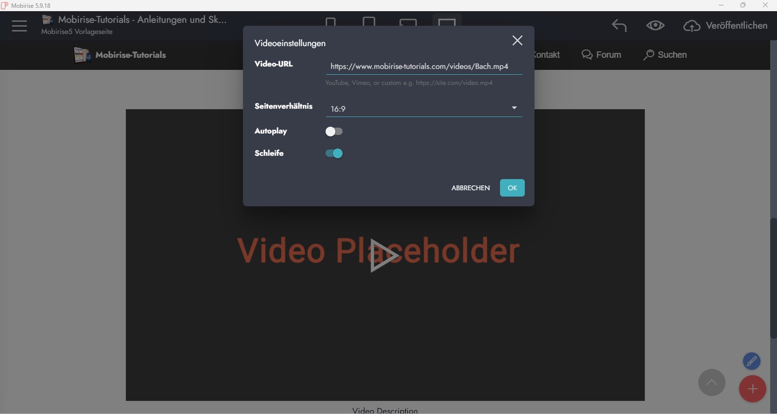 … und dann trage ich die gesamte URL zu diesem Video in Mobirise ein: