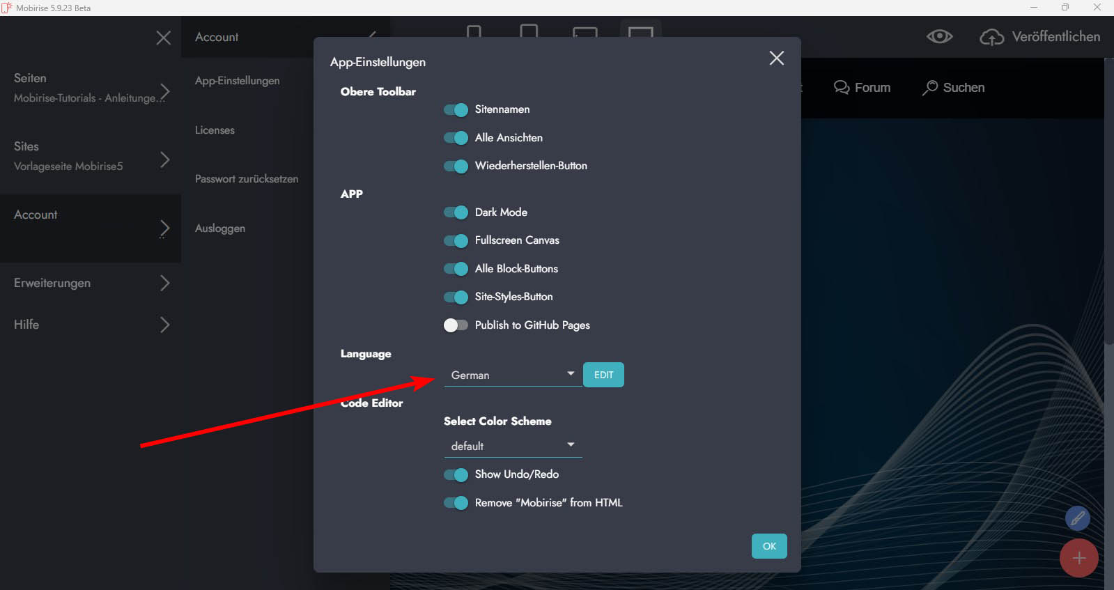 auf Deutsch umstellen. Da betrifft dann aber nur wenige Bezeichnungen. Mobirise hat das so programmiert, dass man sich das dort selbst übersetzen kann.