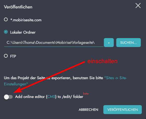 Du hast bei den BETA - Versionen doch unten die Option "Add Online Editor", die Du beim Publizieren mittels Mobirise einschalten kannst: