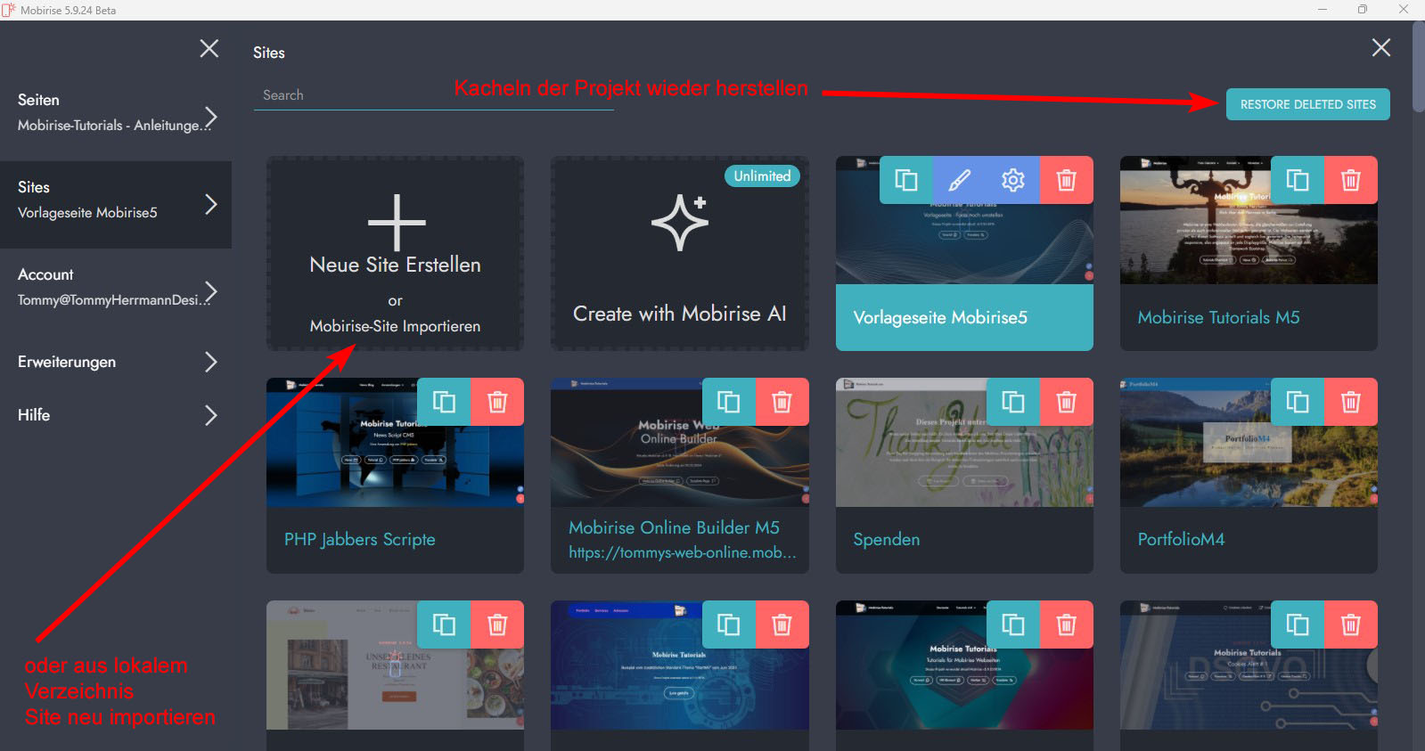 Wenn das auch nicht geht, dann wähle unter Sites oben links "Mobirise-Site importieren" und suche nach dem Verzeichnis Deiner lokalen Publizierung. Dort wähle dann die Datei "project.mobirise" und importiere diese in das gleiche lokale Verzeichnis