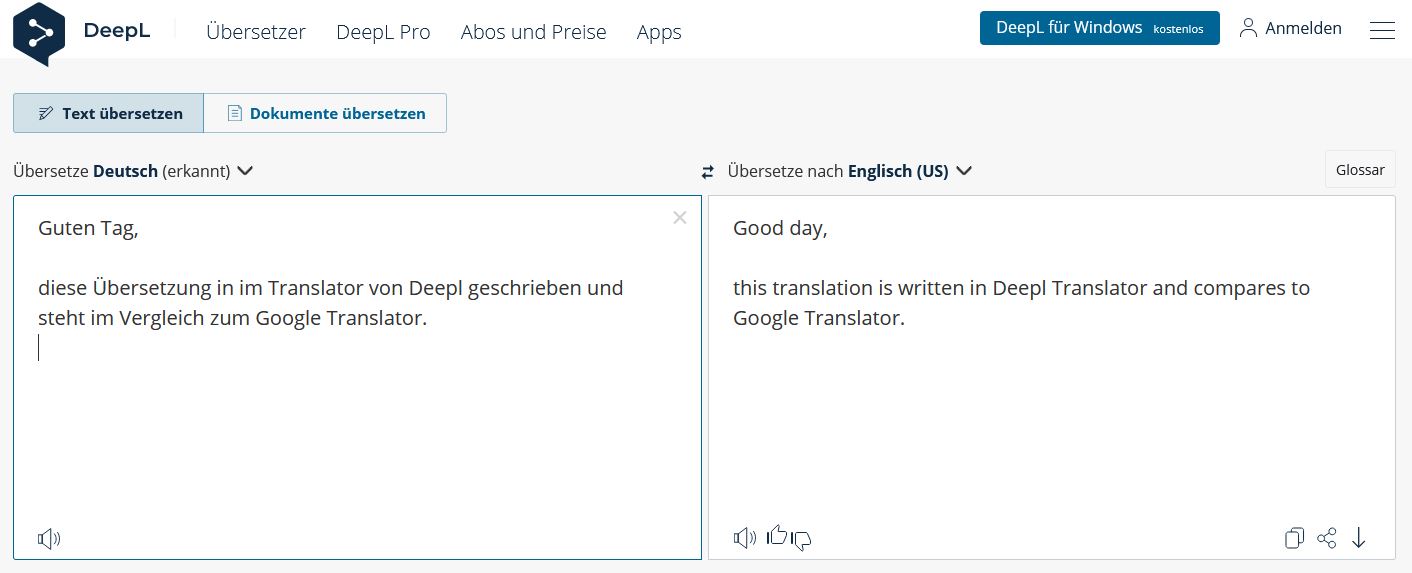 Ich kann den unheimlich großen Unterschied nicht erkennen (wie viele immer wieder behaupten) - hast Du mal ein Beispiel, wo "Deepl" so viel besser als "Google" übersetzt. Das würde mich mal interessieren.