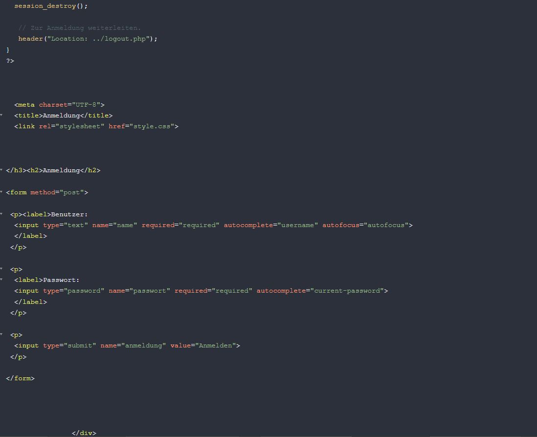 In diesem PHP-Code wird also lediglich überprüft ob der Benutzername stimmt, wenn nicht wird zurück auf die Seite zur Anmeldung umgeleitet, in meinem Fall also zur meiner Seite "Mitglieder.php".