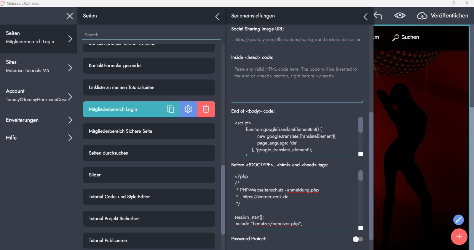 Zur Verdeutlichung meiner bisherigen "Leistung" habe ich ein paar Screenshots beigefügt z.B. vom Code-Editor und dem Server-Verzeichnis bei Ionos. Das Script für die zu schützende Seite habe ich unter Einstellungen der Seite safety_main.php unten rechts eingefügt. Das würde ich dann auf jeder weiteren zu sichernden Seite so einbauen, sobald das funktioniert. Ähnlich meinem bisherigen NOF-Projekt.