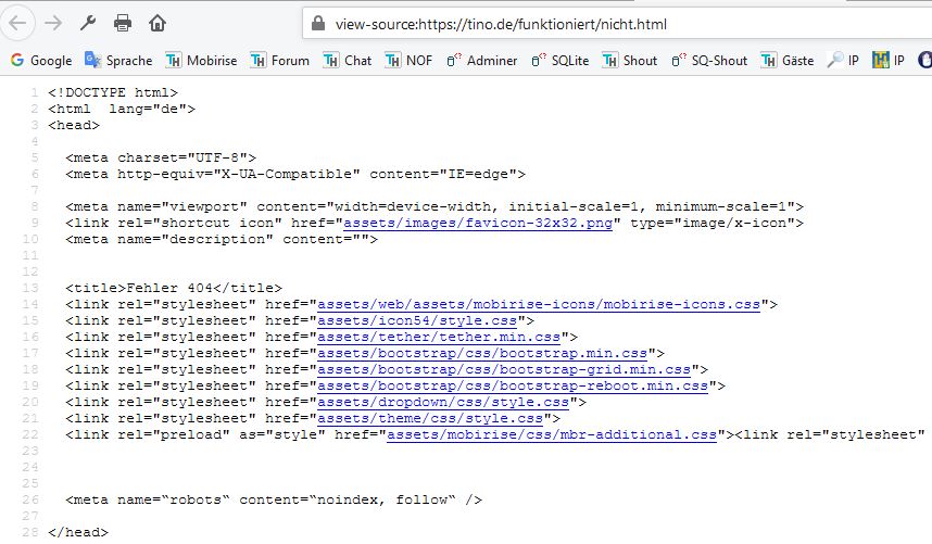 Gebe ich hier eine falsche Seite an, wie z.B. "keineTimeline.html" anstatt "Timeline.html", wird ja durch die .htaccess auf meine in der Root liegende Seite "Fehler.html" umgeleitet, die ich ganz normal mit Mobirise in meinem Projekt auch erstellt habe und die hat ja dort auch ihre CSS-Datei: