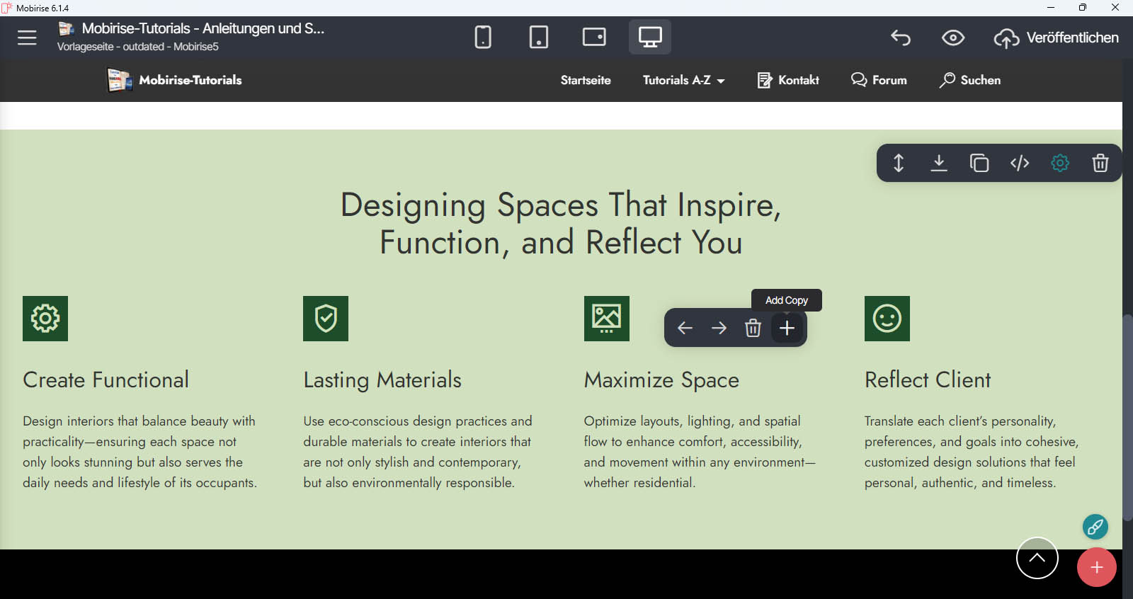 Das muss man allerdings üben, um es wirklich zu beherrschen. Wirklich sinnvoll ist das jedoch kaum, denn in Mobirise findet man fast immer einen anderen Block, der besser oder sogar perfekt passt.