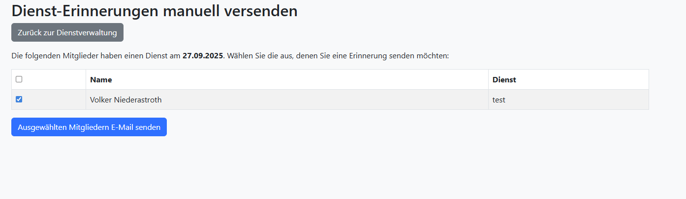 Hab jetzt auch eine Erinnerung für die Dienste drin. Der Admin kann 5 Tage vorher die eingetragenen Mitglider per Button mit Mail erinnern.