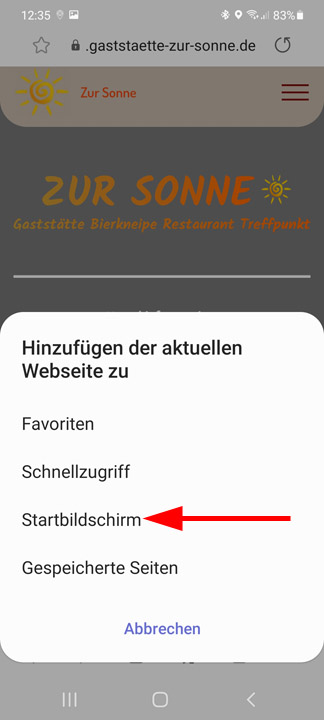 Jetzt Menüpunkt Startbildschirm. Kein Sonnenlogo. Sondern das PWA von MBR.