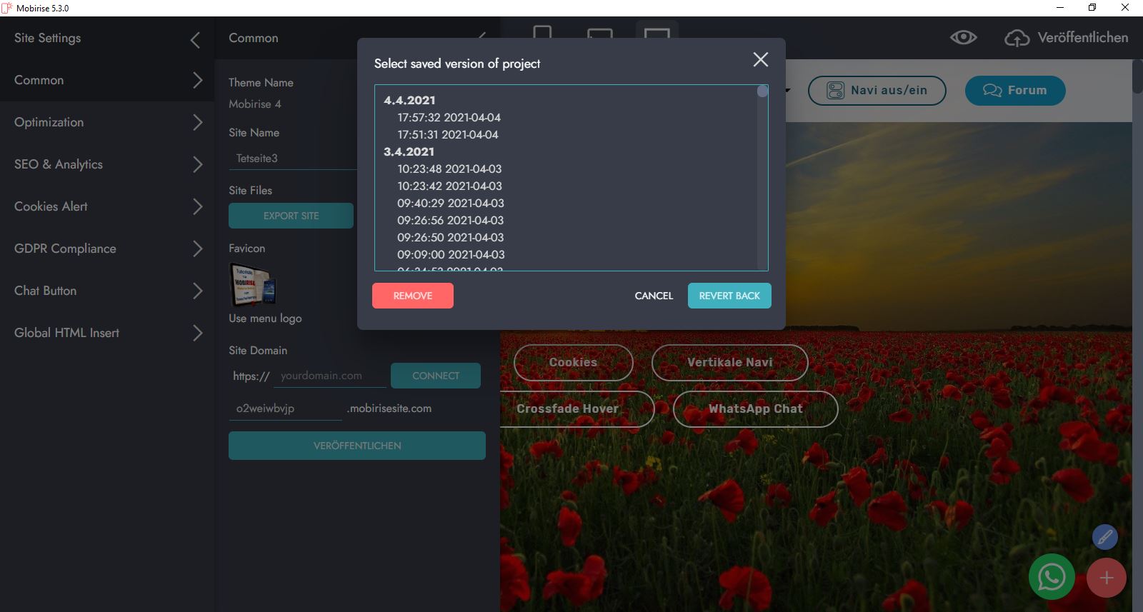 Dort kannst Du jeden beliebige Projekt-Status wieder herstellen, indem Du eine Sicherung markierst und auf den grünen Button "Revert Back" klickst. Das mache ich oft und gerne, wenn ich etwas versaut habe und die Schritte nicht mehr genau weiß. So stelle ich dann die Situation vor der letzten Änderung wieder her.