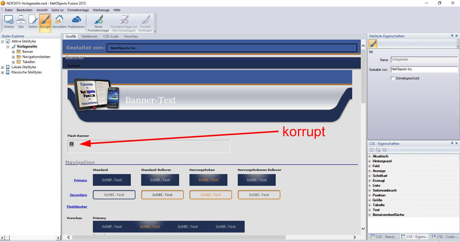 Ihr könnt dieses Problem aber recht einfach lösen, indem Ihr den Flash-Banner und auch die Flash-Navbar aus der Design-Ansicht löscht: