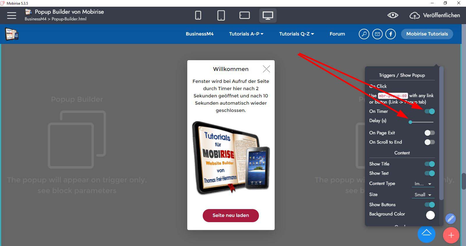 Du schaltest einfach in den Block-Werkzeugen (Zahnrad) vom Popup "On Timer" an und gibst darunter bei "Delay(s)" die Verzögerung in Sekunden an.