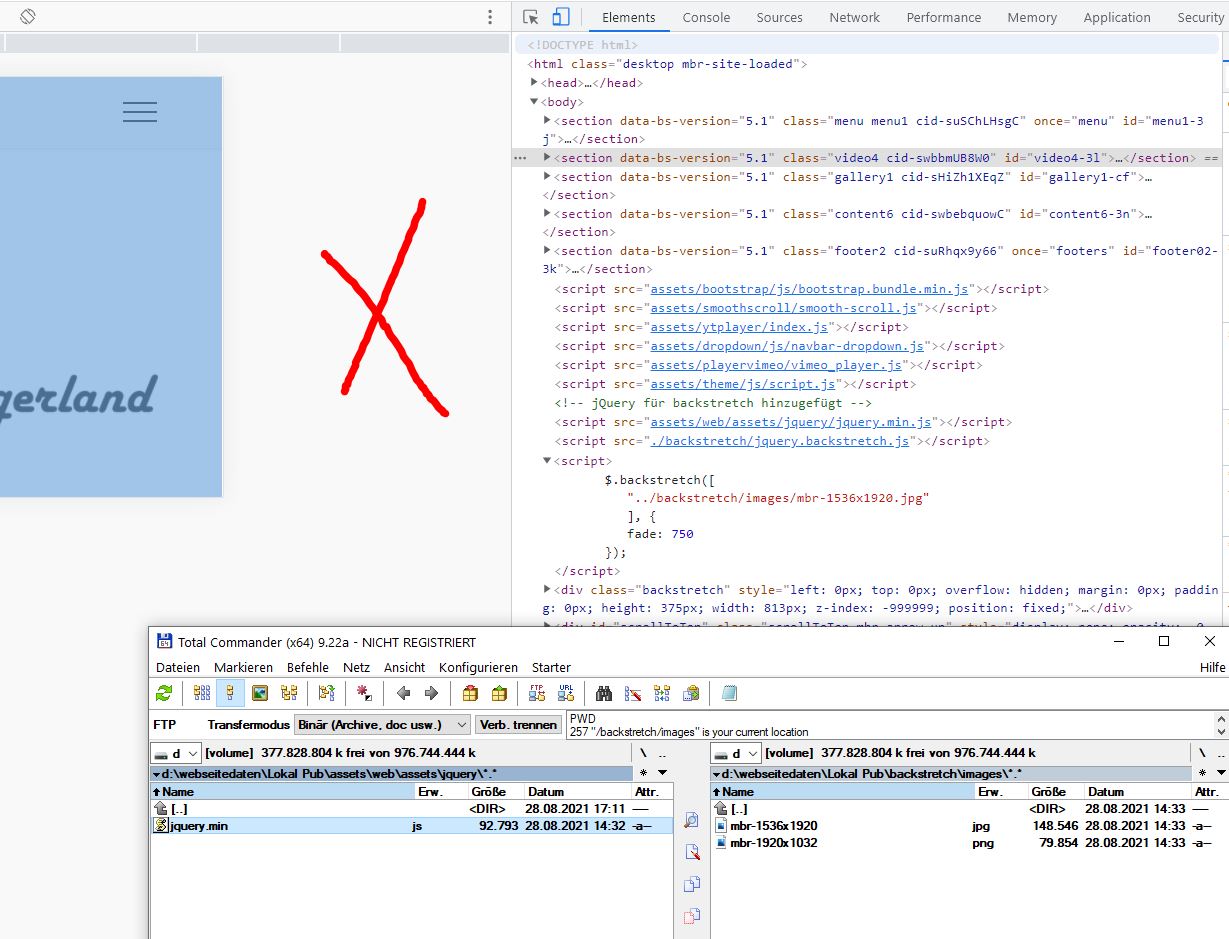 Du musst das Verzeichnis "backstretch" mit der Datei "jquery.backstretch.js" auch auf den Server kopieren, also das in das Stammverzeichnis, dort wo auch die "index.html" (Startseite) Deines Projektes liegt: