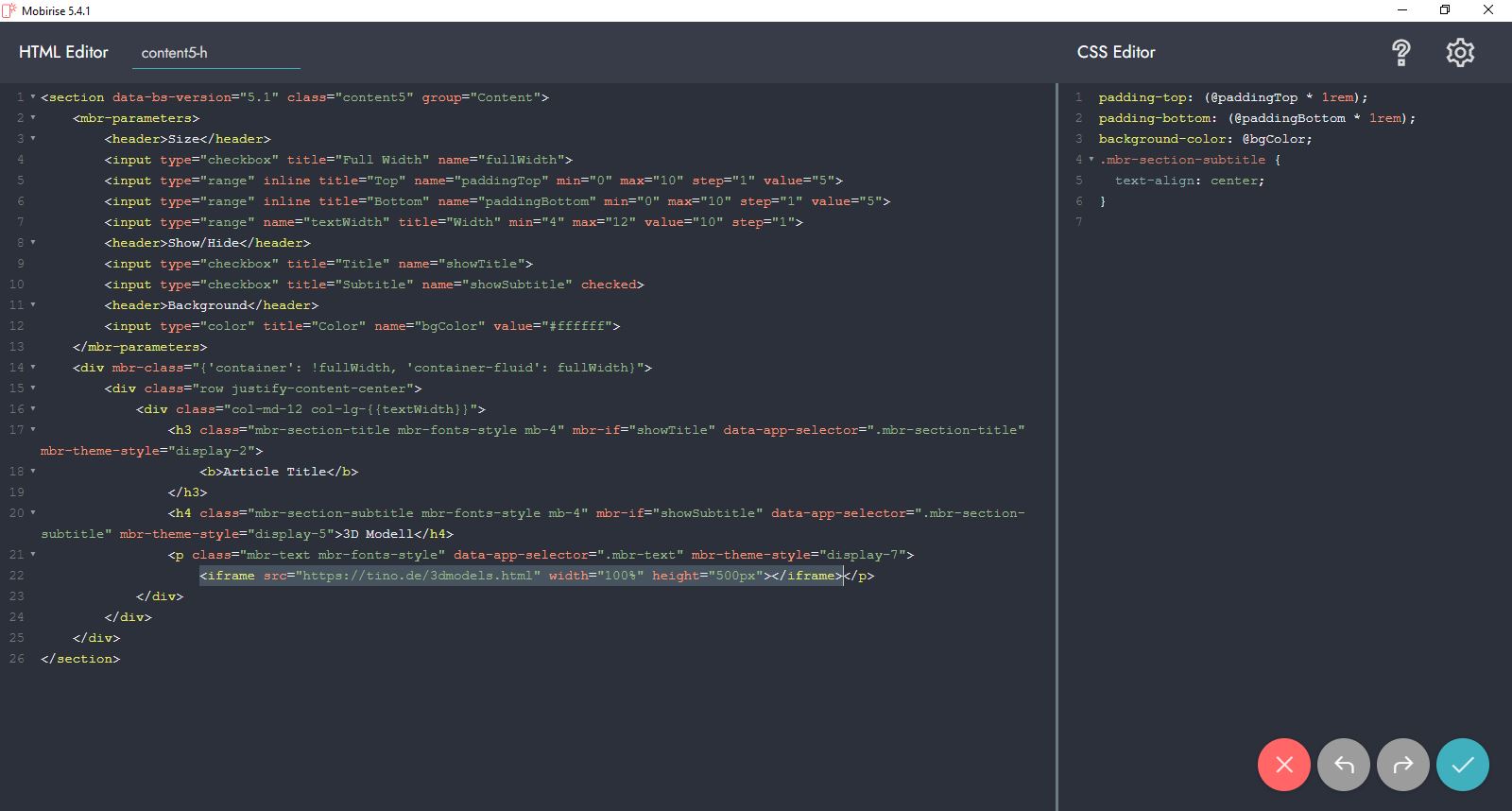 ... hier habe ich dafür einen einfachen Textblock aus der Rubrik "Article" vom Thema "Mobirise 5" verwendet und einfach den Beispieltext mit dem Iframe ersetzt: