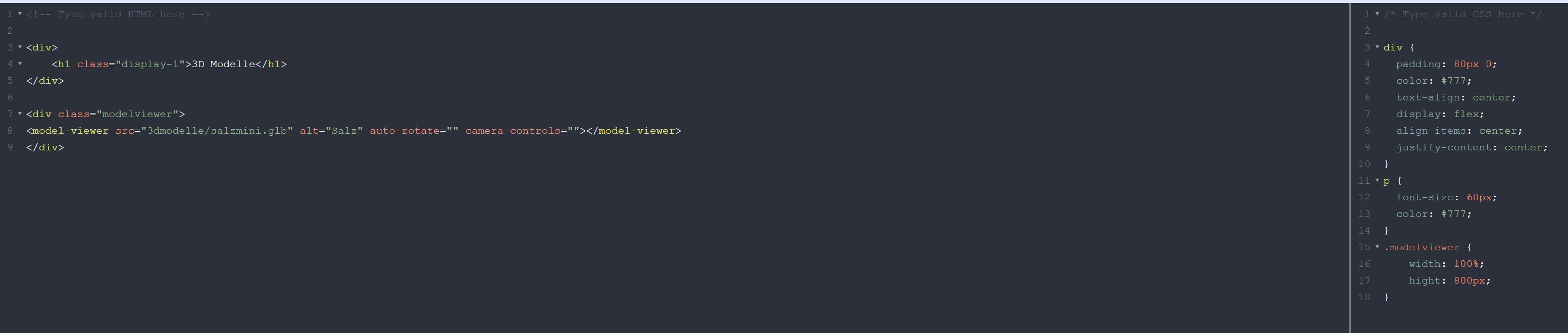 Egal was ich da veranstalte, ob ich einfach mal rechts aus CSS alles rauslösche, links alles mit "div" rund um modelviewer lösche, alles mit modelviewer in die class display-1 schiebe, es bleibt dabei dass das 3D-Modell klein abgebildet wird. Nur die Position verschiebt sich.