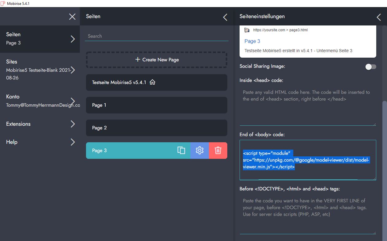 Ich möchte die HTML-Seite nicht in Mobirise einbauen, sondern möchte mit Mobirise eine Seite erstellen, worin die GLB-Datei angezeigt wird. Da ich es so dann nie hinbekommen habe, dass es bildschirmfüllend angezeigt wird, habe ich einfach mal eine separate HTML-Seite erstellt und geschaut wie das dann mit dem Skript aussieht. Das sieht dann gut aus, s. verlinkte Seite ohne meine mit Mobirise erstellte Website drumherum.