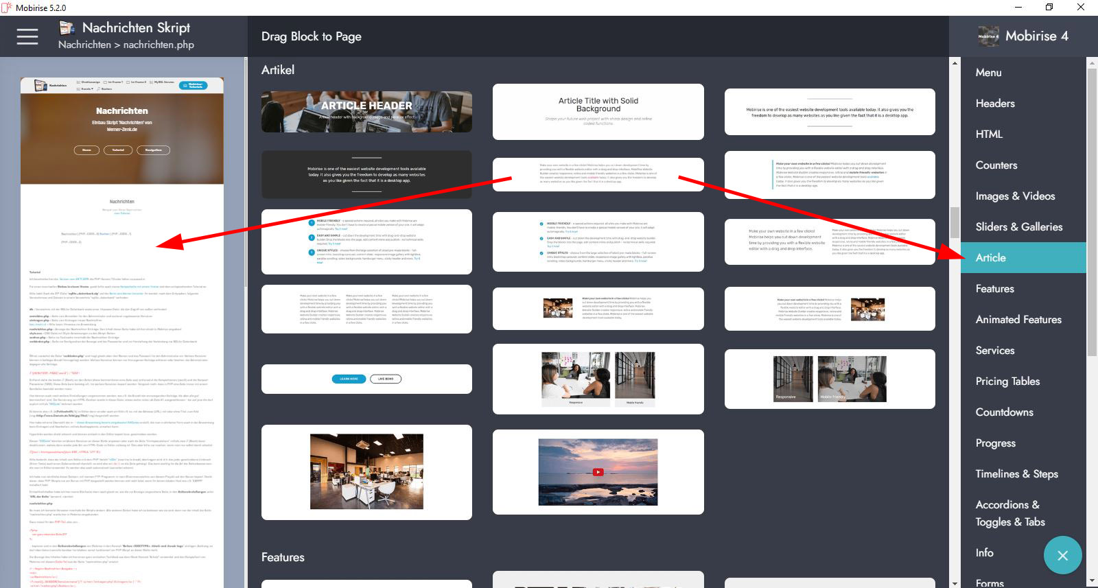 Zum Einbau könnt Ihr eigentlich jeden Block verwenden, allerdings benötigt man bei vielen Blöcken sehr große Kenntnisse von Bootstrap-CSS und den ganzen bereits von Mobirise verwendeten CSS-Anweisungen. Daher empfehle ich immer zunächst einen ganz einfachen Textblock zu verwenden, wie z.B. jenen aus der Gruppe "Article", hier im Beispiel aus dem Standard-Thema "Mobirise 4". Dort ersetzt Ihr dann ganz einfach den Beispieltext von Mobirise mit dem PHP-Skript.