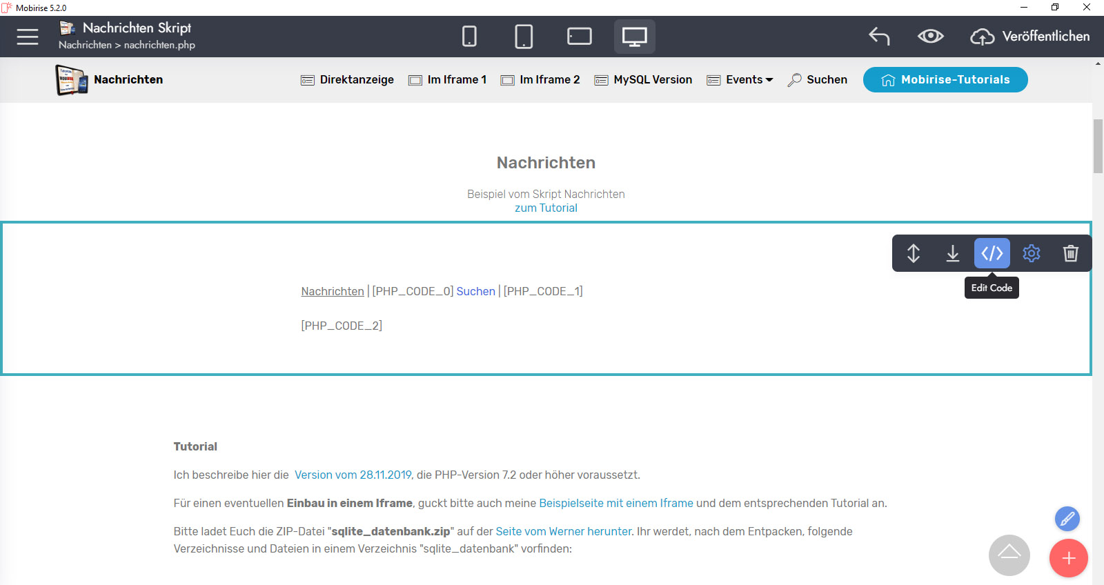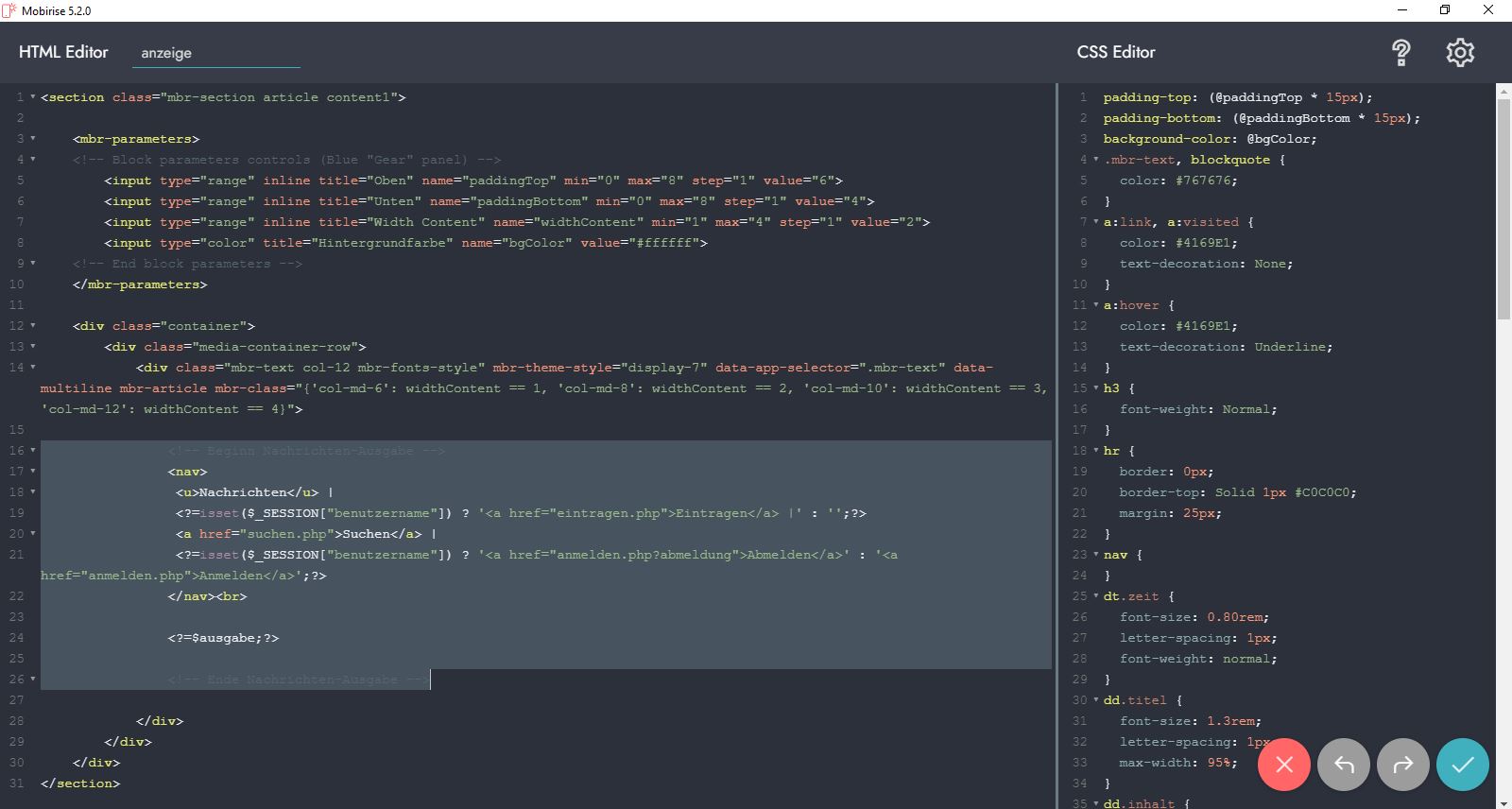 Für den Einbau des eigentlichen PHP-Skriptes zur Anzeige auf der Webseite zieht man sich dann, wie oben beschrieben, einen einfachen Textblock auf und ersetzt im Bereich "HTML Editor" des "Code Editors" den Beispieltext von Mobirise mit dem Inhalt des Skriptes, also das was zwischen den <body> Tags steht.