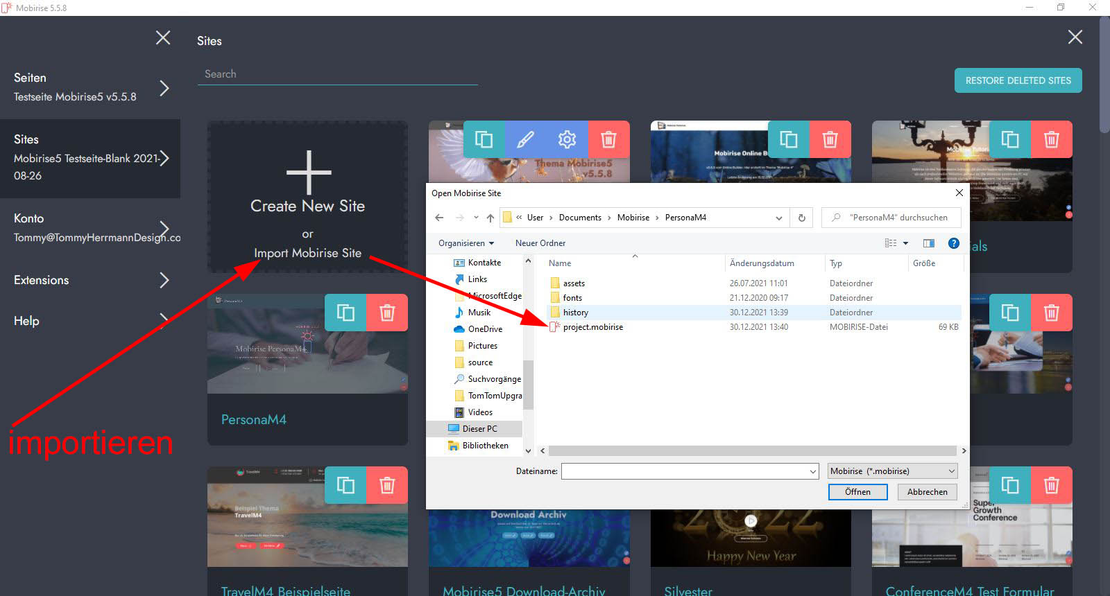 Am anderen Computer musst Du dann jeweils (einmalig) das andere Projekt importieren, indem Du aus dem kopierten Verzeichnis (oben im Screenshot) die Datei "project.mobirise" mit der Software importierst: