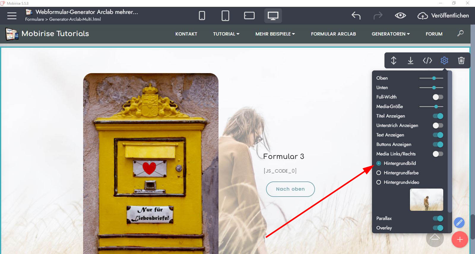 Wenn Du hinter dem Formular später einen Mobirise-Hintergrund haben möchtest, dann musst Du mal gucken, ob Du den Hintergrund im Formulargenerator überhaupt nachträglich transparent machen kannst.