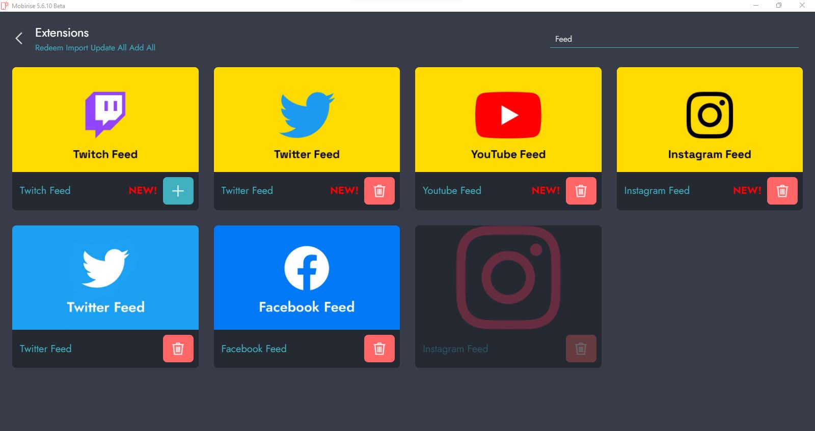 Mobirise hat nun neue Social Media Feeds vom Drittanbieter "ElectricBlaze" in den Erweiterungen.