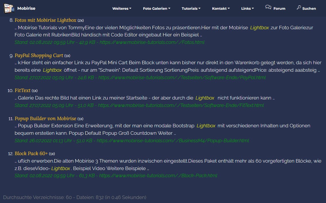 Da ich, nach wie vor, sehr skeptisch bin solche Anwendungen in mein Mobirise einzulesen, habe und werde ich das nicht ausprobieren, zumal ich ja zwingend eine Suchmaschine über meine Verzeichnisse benötige. Das wird ja dann in die Software installiert und nicht nur in ein Projekt. Meine Angst, mir da etwas an der Software zu zerschießen ist zu groß, außerdem habe ich immer noch Copyright-Bedenken, wegen der Nutzung vorhandener Mobirise Werkzeuge.